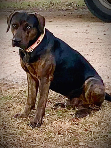 MoJoe is our only male breeding dog. Solid Dark Brown w/ Brindle Trim & Amber eyes